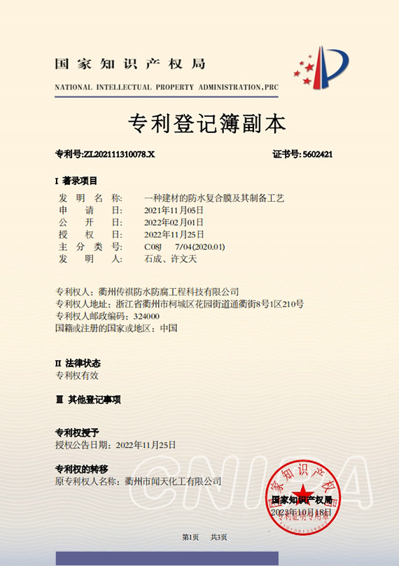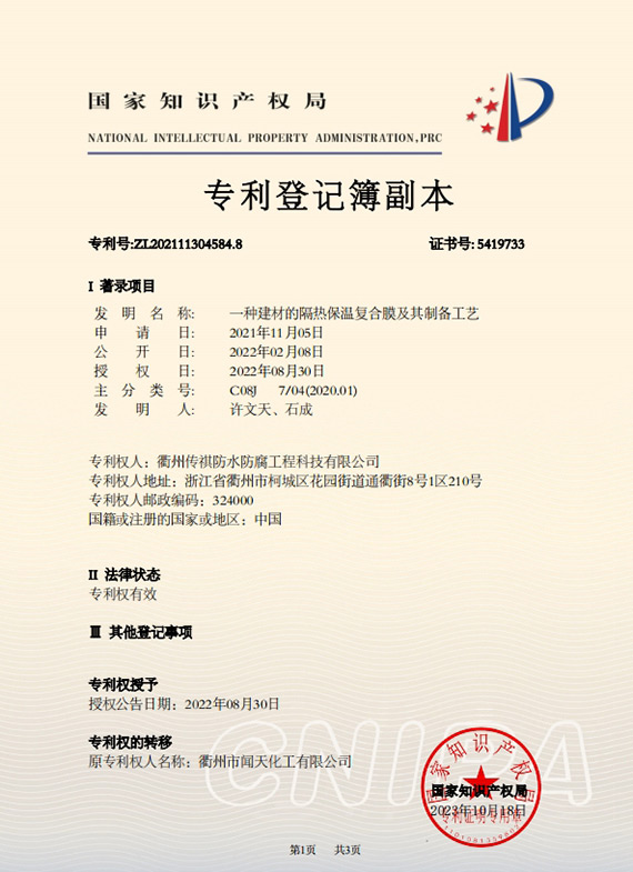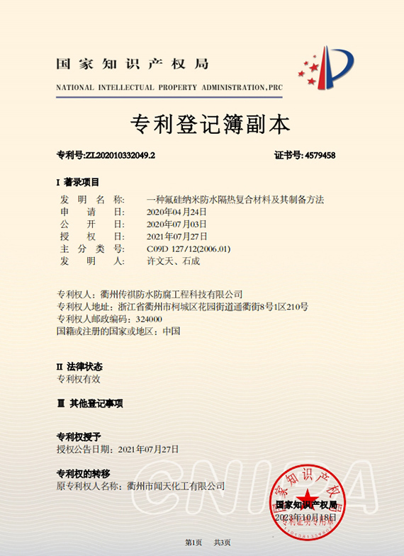 衢州傳祺新材料科技有限公司是衢州市聞天化工有限公司的下屬企業(yè);衢州市聞天化工有限公司成立于2003年,是國內最早研發(fā)、生產氟碳涂料的企業(yè)之一。衢州傳祺新材料科技有限公司成立于2017年,公司專注于高分子氟材料的開發(fā)和含氟材料在防腐、防水領域的應用。經(jīng)過6年的不懈努力,已獲得了化工和建筑領域六項國家發(fā)明專利授權和兩項新產品科技成果獎,參與了中國建筑材料流通協(xié)會《房屋修繕防水工程規(guī)范》標準的編制工作,中建協(xié)涂裝委員會浙西工作站設立在我公司。